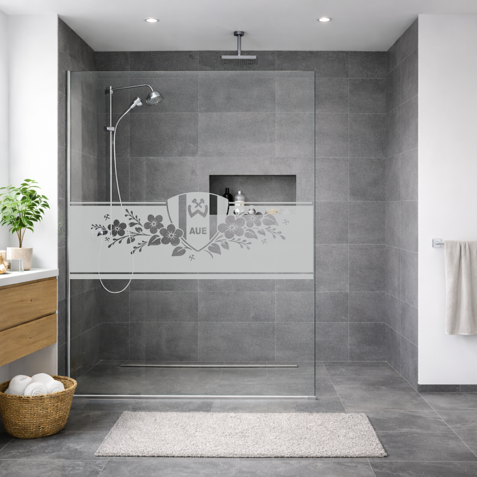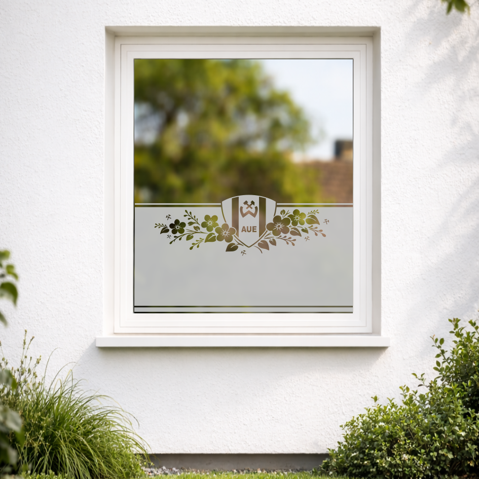 Sichtschutz – Im Angebotsbild ist die Glasdekorfolie grau dargestellt und bietet an diesen Stellen Blickschutz. Bei den ausgeschnittenen Bereichen des Motivs bleibt die Scheibe sichtbar.
