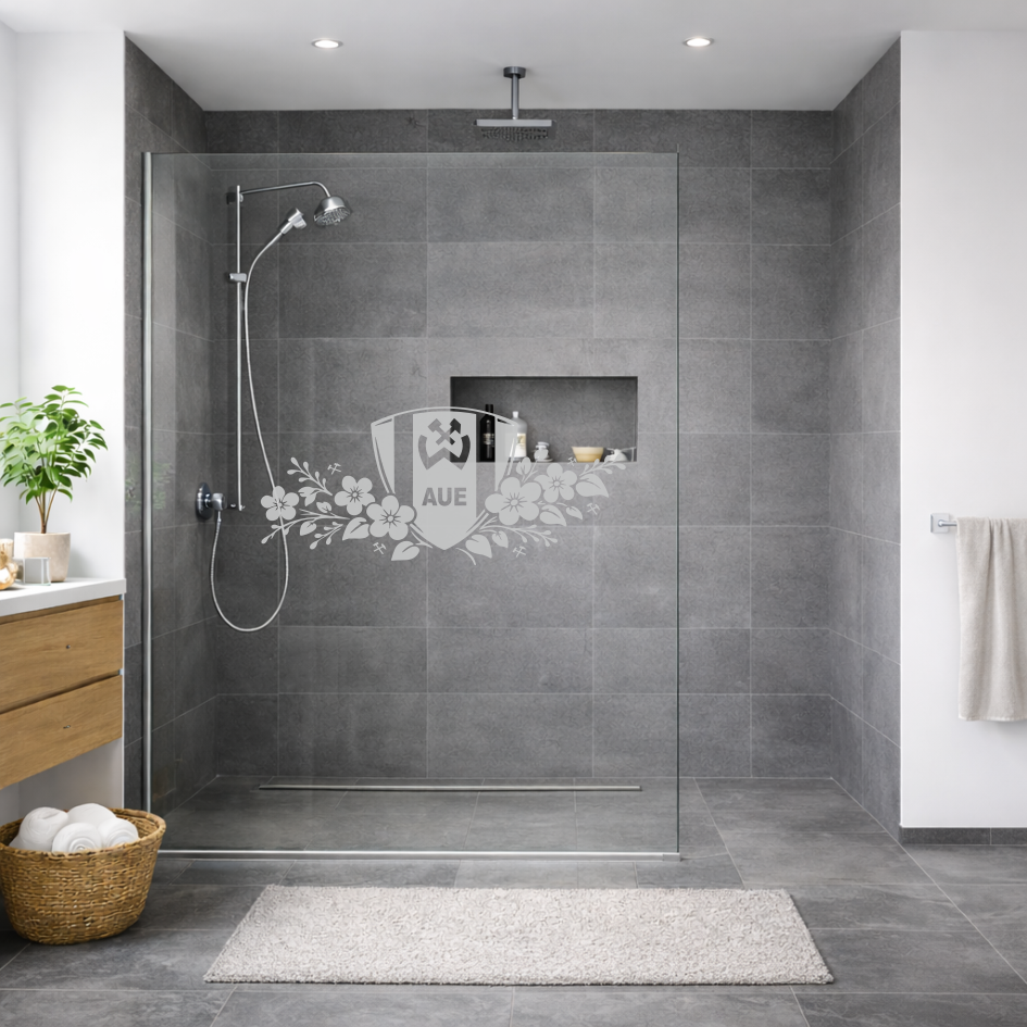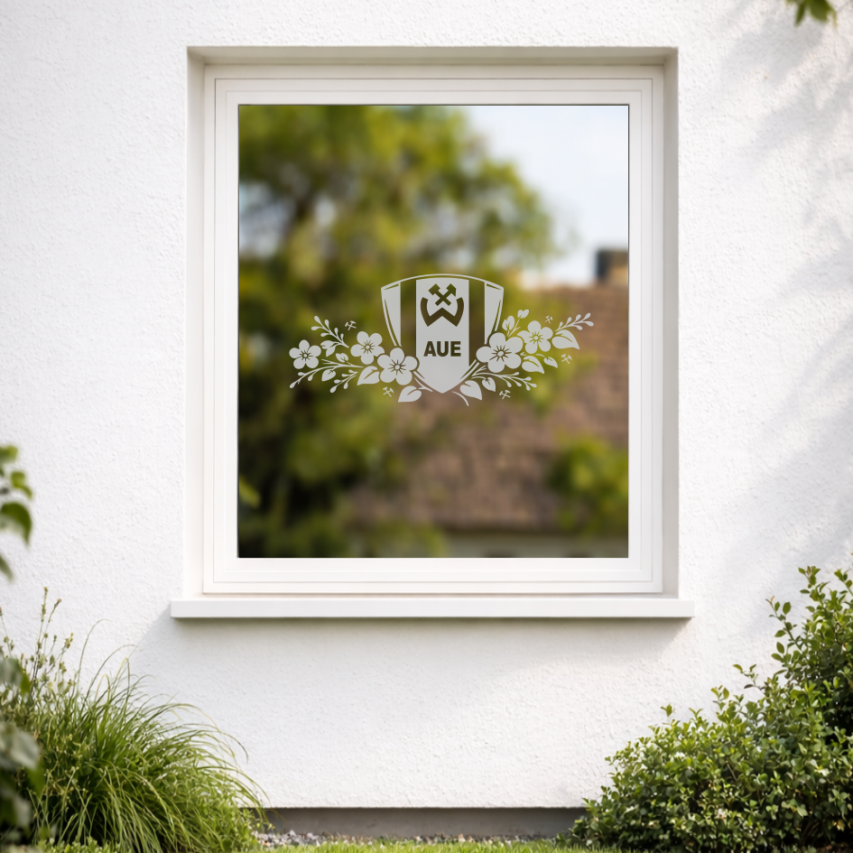 Sichtschutz – Im Angebotsbild ist die Glasdekorfolie grau dargestellt und bietet an diesen Stellen Blickschutz. Bei den ausgeschnittenen Bereichen des Motivs bleibt die Scheibe sichtbar.